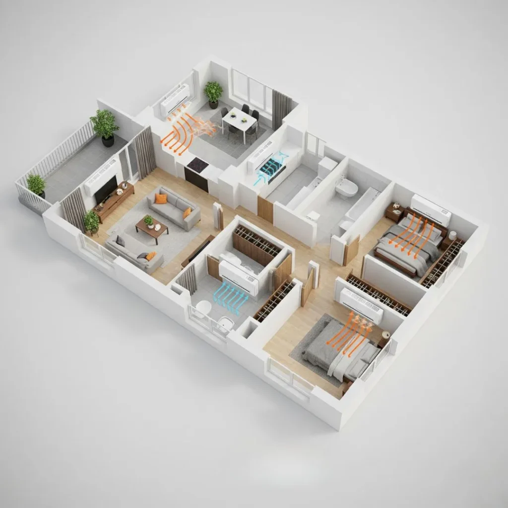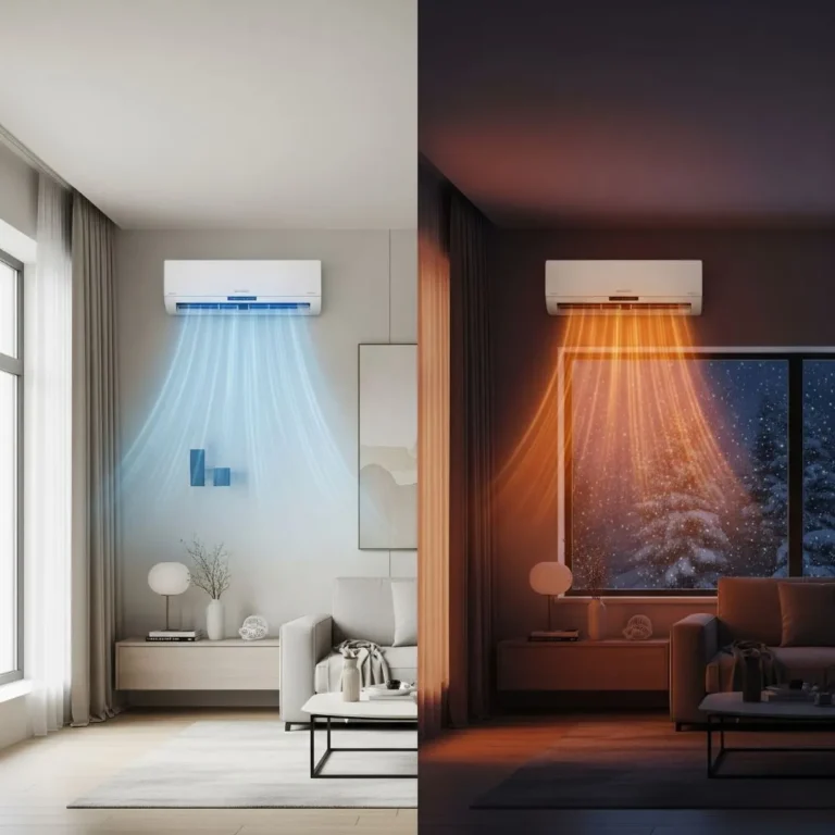 Raffredda d’estate e riscalda d’inverno senza installazioni complicate: senza tubi, senza motore esterno, solo aria pulita e comfort immediato in ogni stagione.